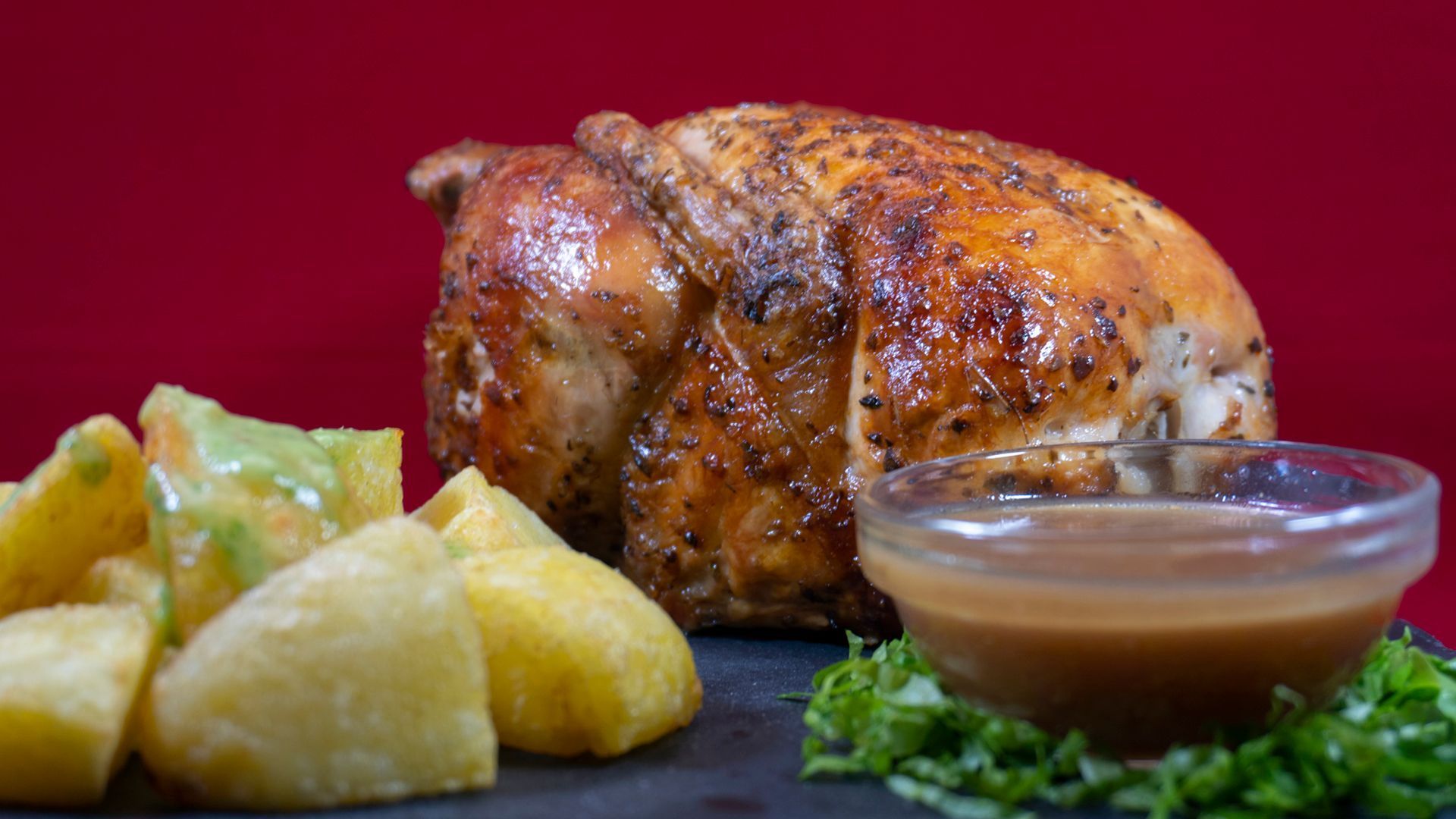 - Nuestro famosísimo pollo asado, que cocinado de la manera tradicional y aderezado con hierbas prsenta un sabor único, jugoso y que se deshace en la boca.